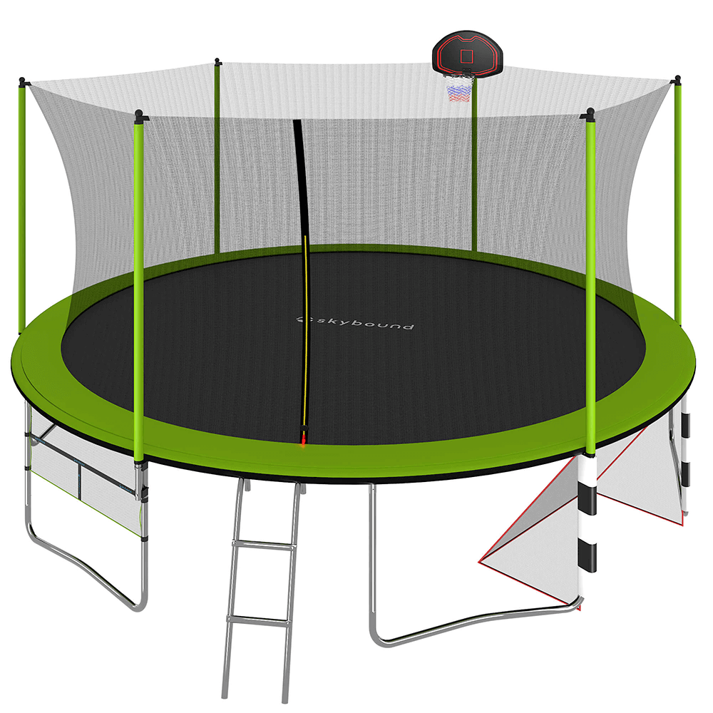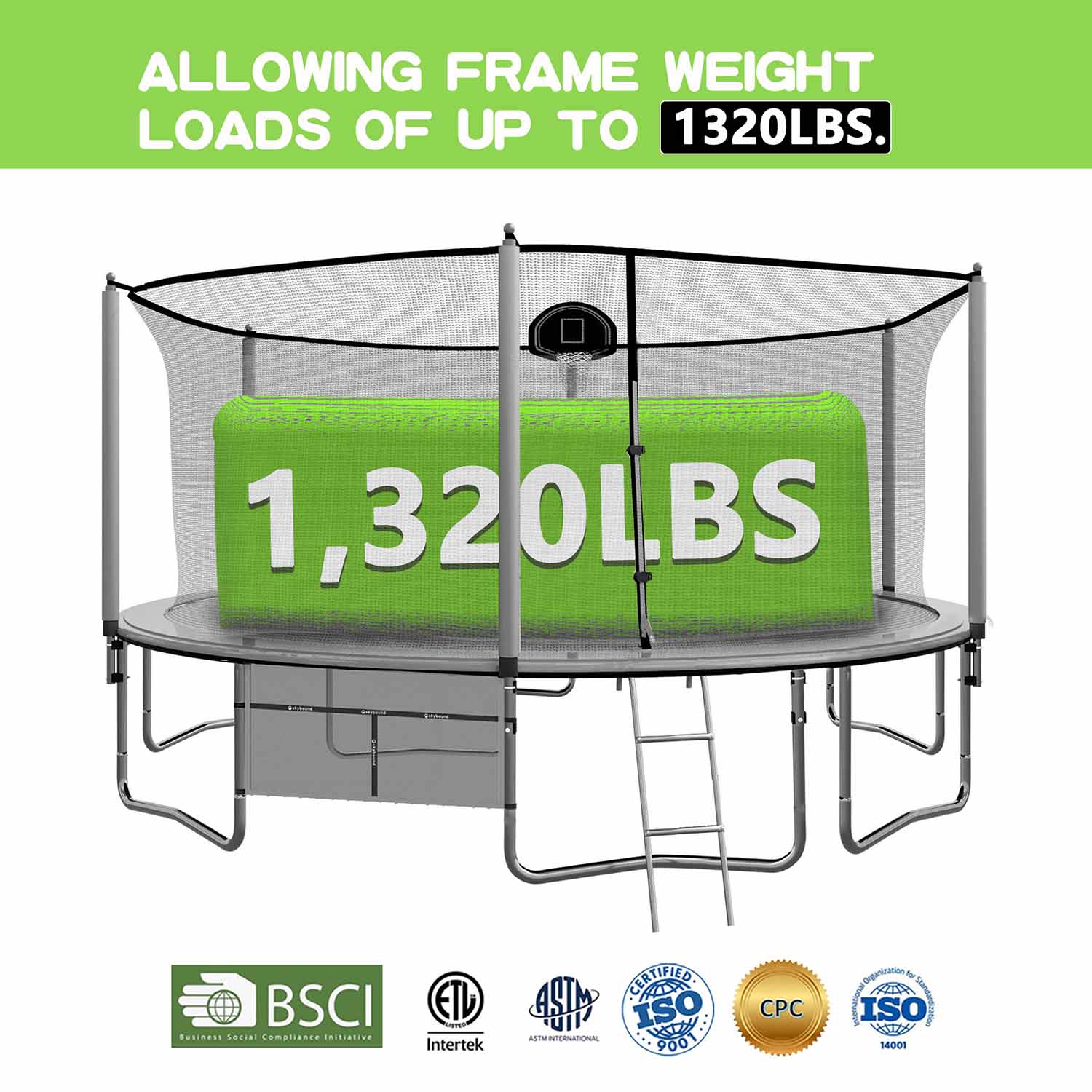 Each trampoline has a different recommended weight capacity. SkyBound trampolines can withstand up to 1500 lbs in static weight. However, according to national trampoline safety guidelines, we recommend one person jumping at a time, with a user weight limit of 200–300 lbs.