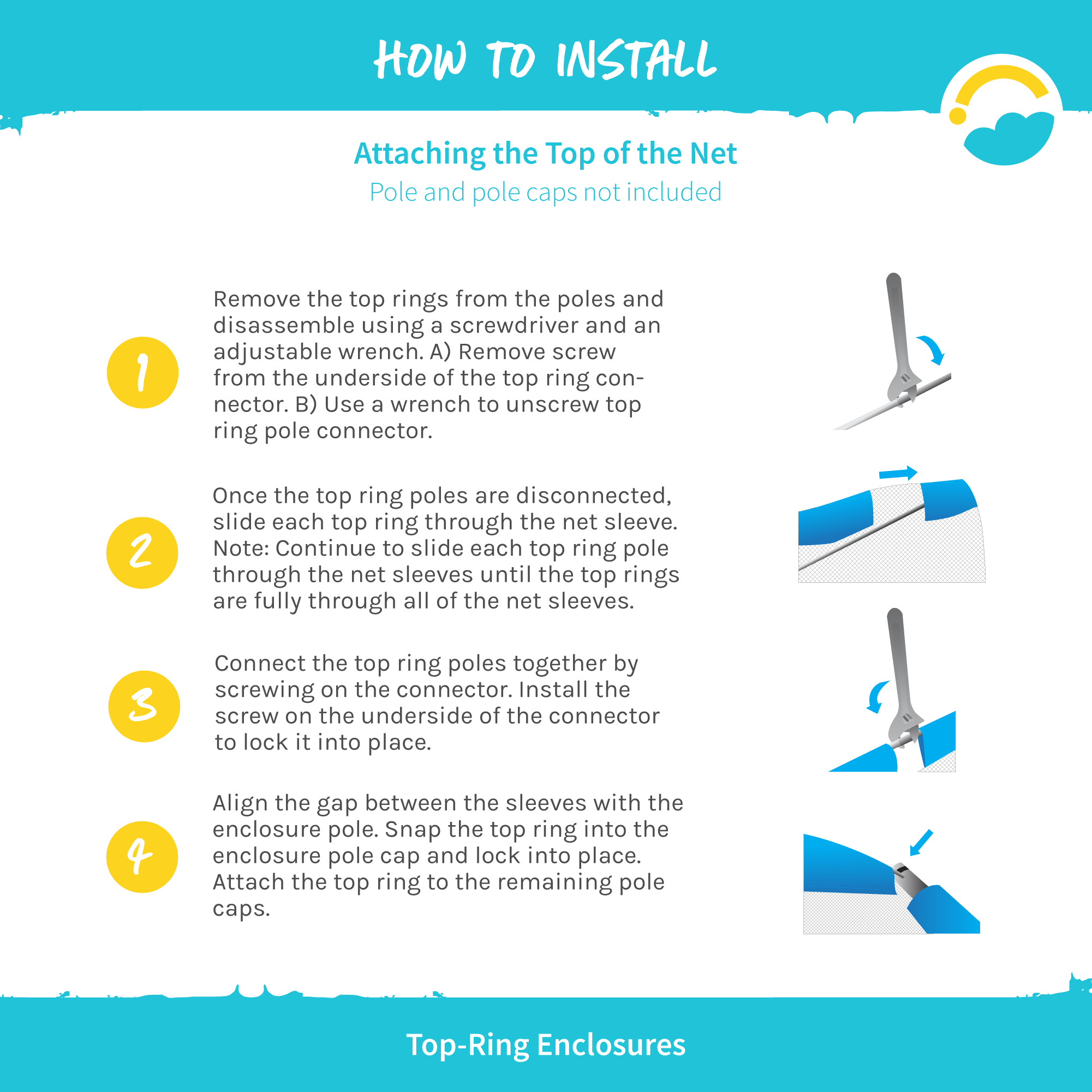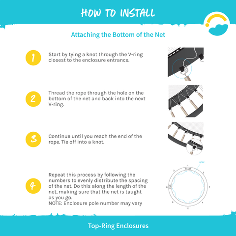 The net has the same design as the original net which came with the Bounce Pro / Sports Power trampoline, which uses a sleeve sewn into the top of the net, which runs the entire length of the net, in which the top ring of your enclosure system slides through. This is different then many other competitor nets, which just use straps and do not have the actual sleeve. This net is specifically designed for the 6 pole and top ring enclosure system of the Bounce Pro / Sports Power 14' trampoline which was and is currently (as of 2014 / 2015) sold in Wal-Mart.