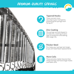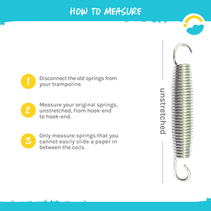 - IMPORTANT: Prior to purchasing, measure your original springs from hook end to hook end, disconnected from your trampoline, and completely unstretched. For more information, please refer to our Spring Measuring Guide, or contact us directly at (888) 891-4689.