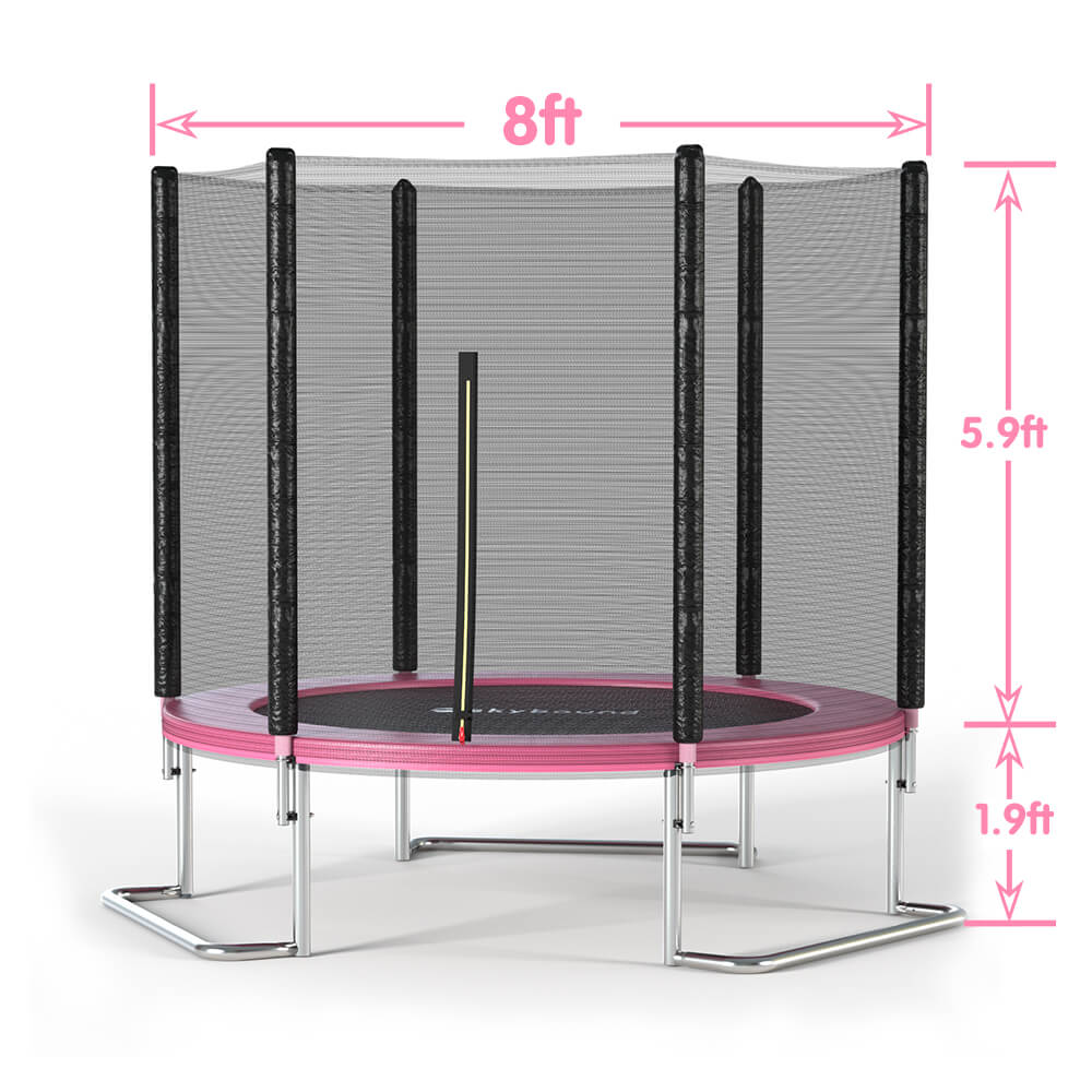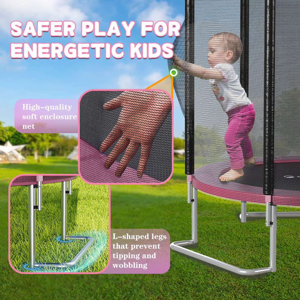 This 8ft L-Shaped Legs trampoline is specially designed for energetic kids. The elevated safety net prevents children from climbing or falling out, while the L-shaped leg structure helps prevent tipping.