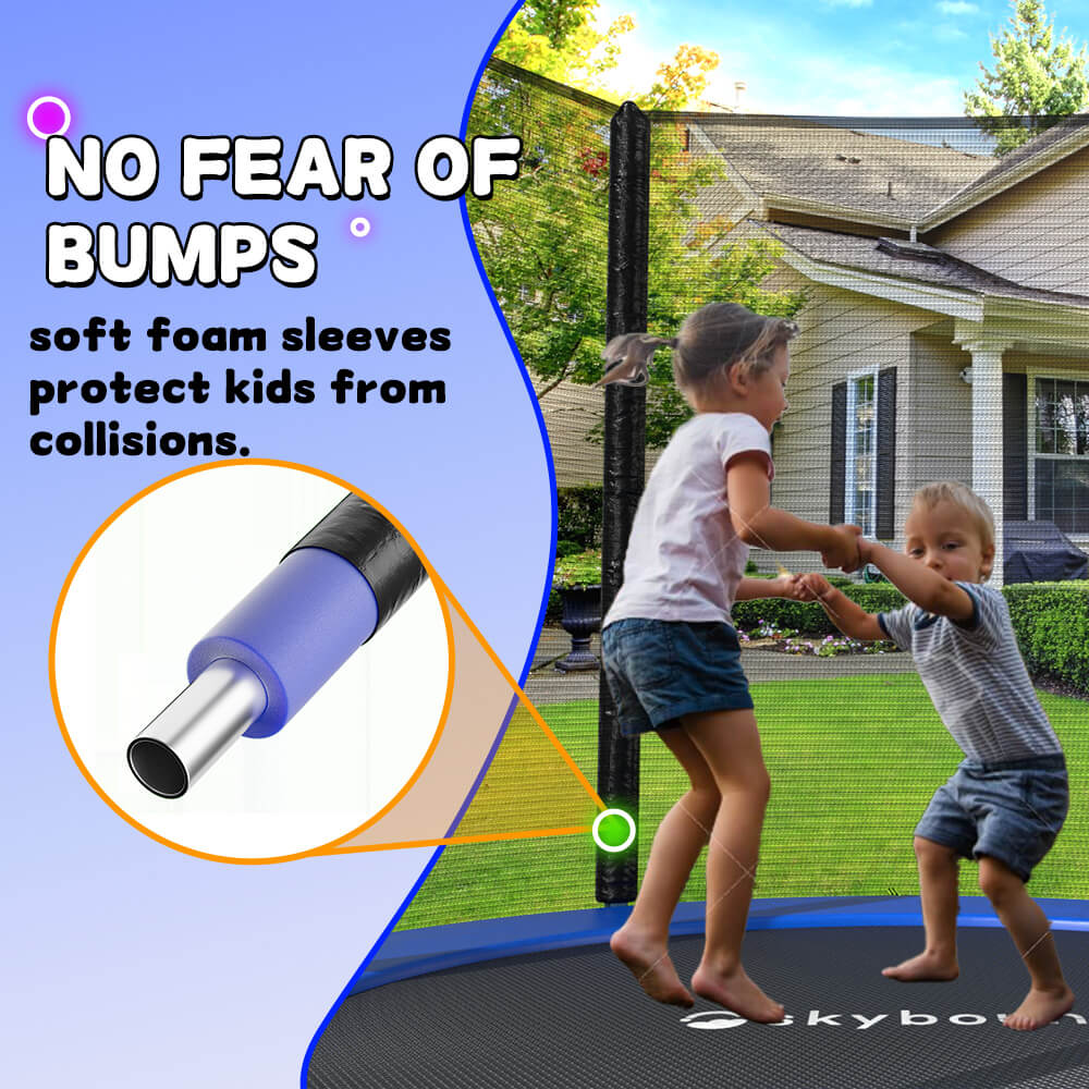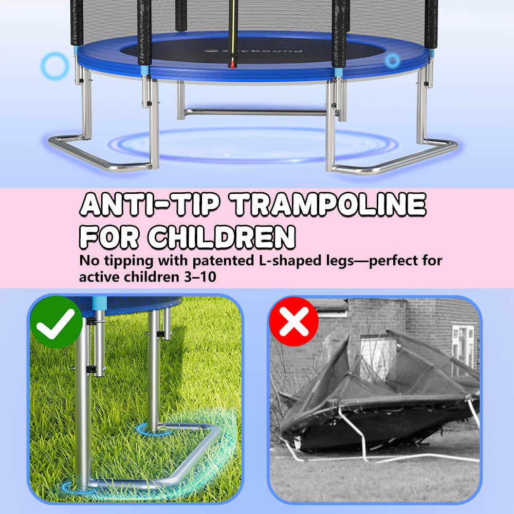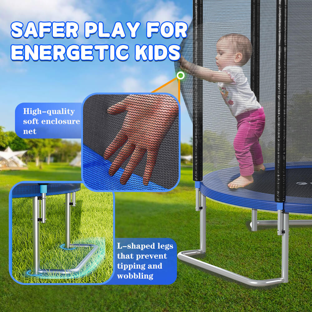 This 6ft L-Shaped Legs trampoline is specially designed for energetic kids. The elevated safety net prevents children from climbing or falling out, while the L-shaped leg structure helps prevent tipping.