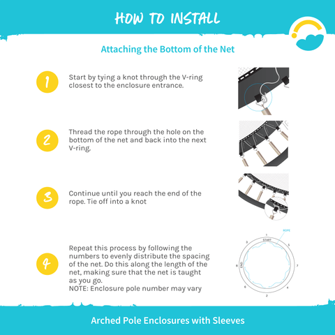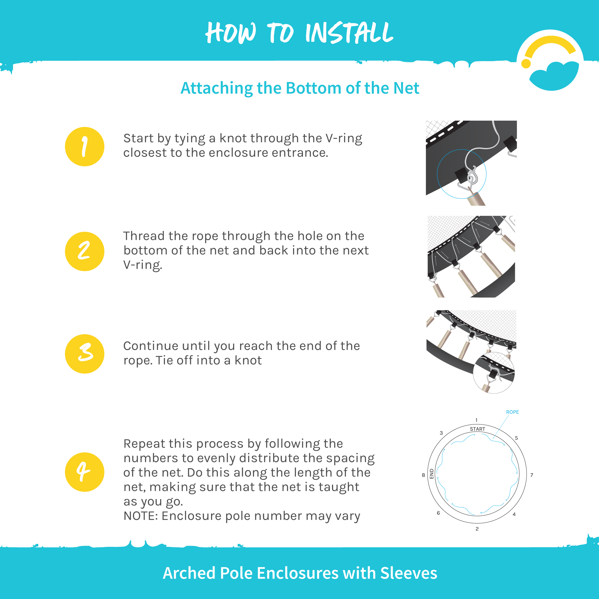 The net has the same design as the original net which came with the Bounce Pro / Sports Power trampoline, which uses enclosure pole sleeves which your enclosure poles slide through. This is different then many other competitor nets, which just use straps and do not have the actual sleeves. This net is specifically designed for the 3 arch Bounce Pro 15' trampoline which was sold in Sam's Club and some other retailers.