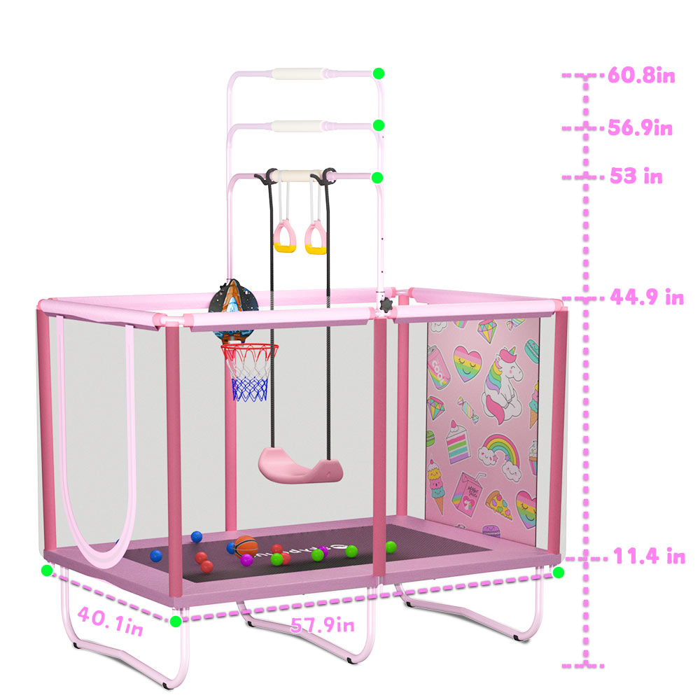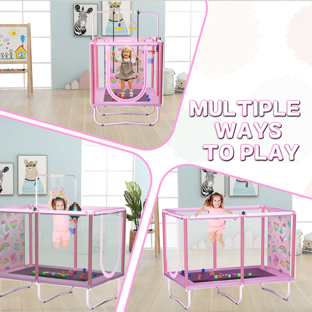 It’s not just a trampoline — it’s a complete mini playground featuring a swing, gym rings, and a single balance bar, giving kids endless ways to jump, swing, and play.